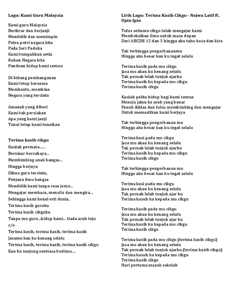 Lirik tulus setiamu cikgu telah mengajar kami membekalkan ilmu untuk masa depan dari abcde 12 dan 3 hingga aku tahu baca dan kira tak terhingga pengorbananmu. Explore the latest videos from hashtags: Najwa latiff feat upin ipin terima kasih . Explore the latest videos from hashtags: Pantun terima kasih kepada cikgu. Discover short videos related to lagu upin ipin terima kasih cikgu lirik on tiktok.